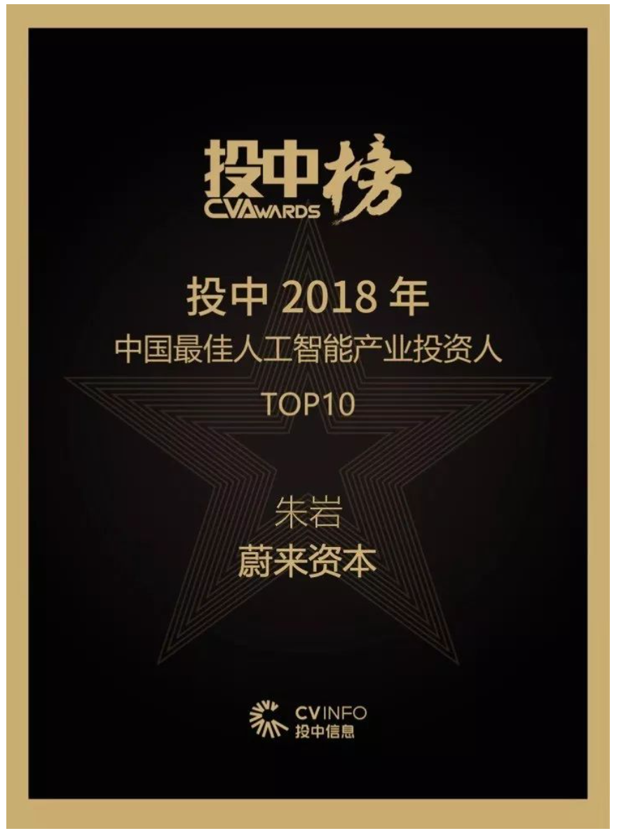 2019年9月19日,投中信息重磅推出“投中榜·年度投资人榜单”,蔚来资本管理合伙人朱岩连续第二年登榜,位列“投中2018年中国最佳人工智能产业投资人TOP10”。