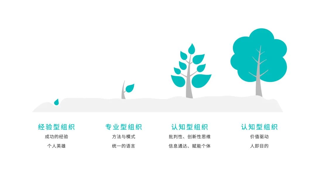 从经验型组织到智慧型组织,企业像一颗有生命力的大树,进化与生长。而这个过程必然经过四个阶段:经验型组织、专业型组织、认知型组织和智慧型组织。从依托个人英雄主义的经验型组织,成长为价值观驱动、以“人”的成长为核心目的的智慧型组织,对很多企业来说是一个痛苦的过程。痛苦的不是方法有多难,而在于认知层面,由内而外基因的改变。而以价值观驱动的,“人即目的”的组织基因,恰恰能赋予企业最强的自生长、自我调节、抗风险和纠错的强大能力。